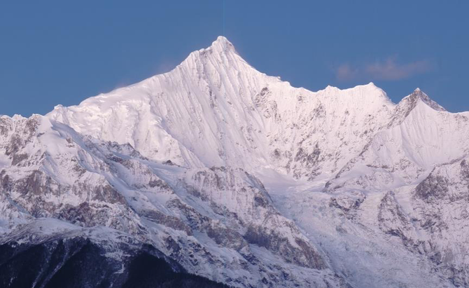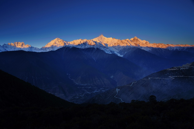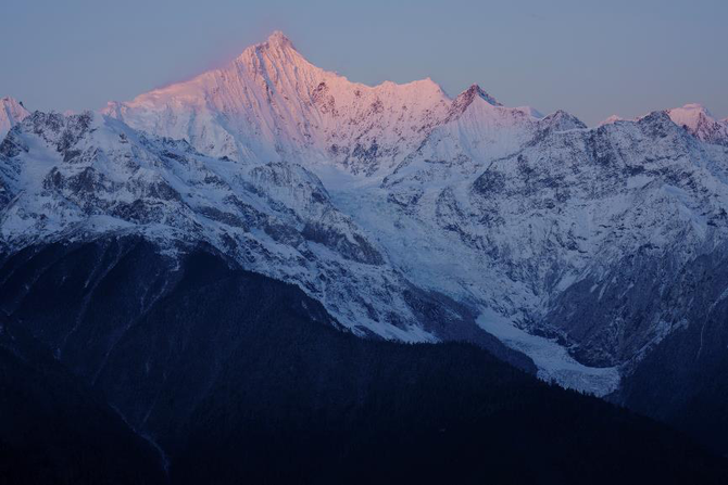 105mm长焦端,拍摄梅里雪山主峰卡瓦博格峰。正好能够拍到清晨第一缕阳光照到峰顶的瞬间。冬天的阳光,不像夏日那么热烈,微微的暖色,带点粉红,有种淡淡的美。