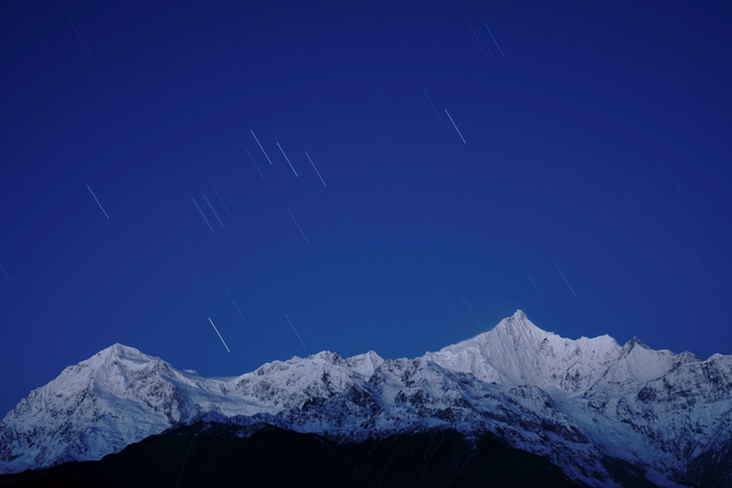 题图那张星轨照片,并不是用堆栈的方式拍成,而是直接长曝7分半钟获得的。画面依然干净清晰,月色下的雪山锐度细节都非常令人印象深刻。